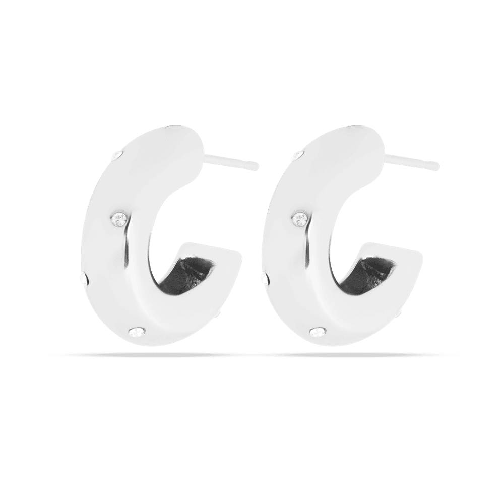 Gli orecchini Aemilia sfoggiano un design audace a forma di “C”, arricchito da piccoli cristalli incastonati che aggiungono un tocco di luce e brillantezza. La loro forma curva e l’ampia superficie bianca offrono un contrasto straordinario che cattura l’attenzione, rendendoli una scelta eccellente per chi cerca di fare una dichiarazione di stile. Il design minimalista ma distintivo è perfetto per accessorizzare look contemporanei, sia per il giorno che per la sera. Questi orecchini sono ideali per chi ama i gioielli che combinano forme classiche con un’estetica moderna e pulita.