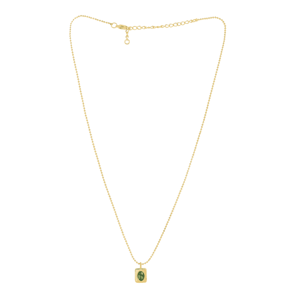 Briseide si distingue per il suo design semplice ma elegante, con un ciondolo rettangolare che incornicia un singolo cristallo verde, posto al centro. Il cristallo, catturando la luce con ogni movimento, proietta una scintillante vivacità che contrasta splendidamente con la catena dorata sottile su cui è sospeso. La catena di lunghezza regolabile termina con una piccola chiusura a moschettone, permettendo di adattarla facilmente a diverse lunghezze per abbinarsi a vari stili di scollatura. Questo pezzo è ideale per aggiungere un tocco di colore e raffinatezza a qualsiasi outfit, perfetto sia per l’uso quotidiano che per occasioni speciali.
